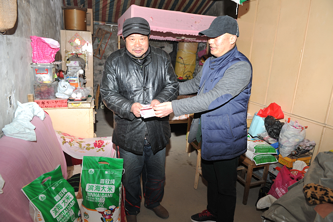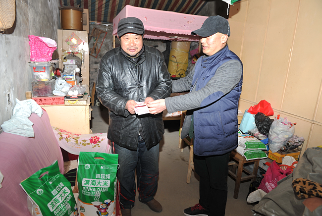 “我代表農(nóng)場個體經(jīng)營戶同林來給你送溫暖,希望你能過上一個幸福、愉快的新年,略表他誠摯的心意和問候26日下午2時分江蘇農(nóng)墾淮海農(nóng)場社區(qū)城西居委會主任臧成龍?zhí)氐亓嘀鴥纱竺祝?/span>手持1000元現(xiàn)金來到振興小區(qū)特困職工嚴建明的家中說。