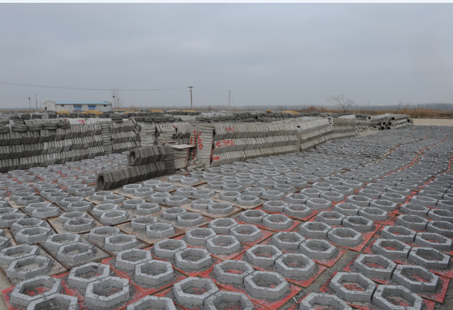 圖為四十六場(chǎng)頭上已經(jīng)堆滿一壟壟的六角塊和六角塊預(yù)制品加工生產(chǎn)時(shí)工人忙碌時(shí)的鏡頭。