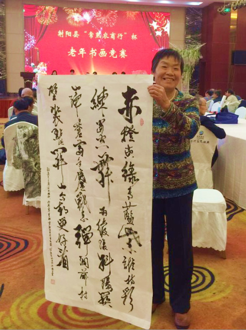 據(jù)了解,趙梅生原是江蘇農(nóng)墾淮海農(nóng)場石油機械廠的退休職工,她不但能寫一手瀟灑的字,而且小篆、隸書、楷書、草書等書法樣樣精通,家中存有一卷一卷的各類書法作品;經(jīng)她創(chuàng)作的人物肖像、山水畫、素描等作品,家中堆成了一摞一摞的。對特別鐘意、栩栩如生的繪畫,她總是裝裱起來,掛在大廳或是送給友人。無論是在上海普佗區(qū)陽光二居委書畫協(xié)會出版的《晚霞余輝》書畫作品選中,還是農(nóng)場書畫室陳列的精品展上,我們都可看到趙梅生的名字和熟悉的畫,沒有想到今年已是73歲的她,還能寫畫出如此逼真、如此飄曳的書法書畫,真是看了令人嘆為觀止。2016年7月,趙梅生書寫的小篆“勿忘抗日戰(zhàn)爭,頌揚民族精神,反對侵略占領(lǐng),維護世界和平”排在了拾貝軒網(wǎng)絡(luò)書法展第9名;同年10月,在射陽縣老齡協(xié)會、縣老齡辦聯(lián)合主辦的射陽縣“常熟農(nóng)商行”杯老年書畫競賽上,趙梅生的草書又獲得了二等獎;2017年在砥礪奮進的江蘇農(nóng)墾書畫大賽上,趙梅生又以一幅山水畫、一幅草書獲得了江蘇農(nóng)墾“喜迎十九大和集團黨代會、喜慶江蘇農(nóng)墾成立65周年”書畫作品展優(yōu)秀作品。