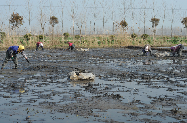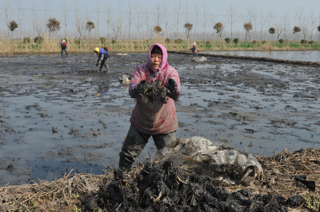 雖已初春,乍暖還寒。春節過后,淮海農場愛蓮苑水生花卉基地里就是一派忙碌。每天,農場下崗職工陸寶珍正常與其他10多名員工一起,頭戴著圍巾,穿著水褲,手持小鍬,拖著塑料薄膜,在睡蓮池中采摘睡蓮的根芽。等采集到一定量后,就按規格進行分撿、計數打包,隨即按公司訂單需求,銷往全國各地甚至從海空渠道托運到國外市場。