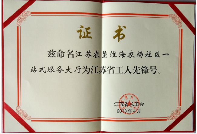 近日,省總工會授予江蘇農墾淮海農場社區一站式服務大廳獲江蘇省工人先鋒號榮譽稱號,這是淮海農場社區首次獲此殊榮。