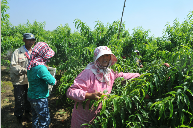 “到農場來干活,距家又不遠,而且常年都有事做,家務事又不耽擱,每年很輕松收入就近兩萬元。”李老漢一邊拎著塑料筐跟在婦女后邊放著桃,一邊跟筆者說著。三四年前,李老漢就開始到果園里來務工,主要從事果樹的修剪、施肥、疏花、采摘、鋤草、澆水等管理工作。與李老漢那樣,僅新東村在果園常年打工的還有其他10多名村民。
