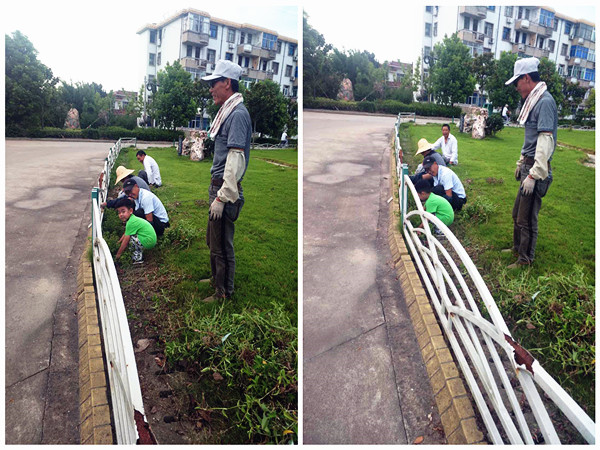 8月22日下午5點,在新洋農場有限公司機關大樓門前的草地上,幾名綠化工正在拔里面的雜草,他們當中,一個穿綠衣服、看上去四五歲的小男孩吸引了路人的注意。