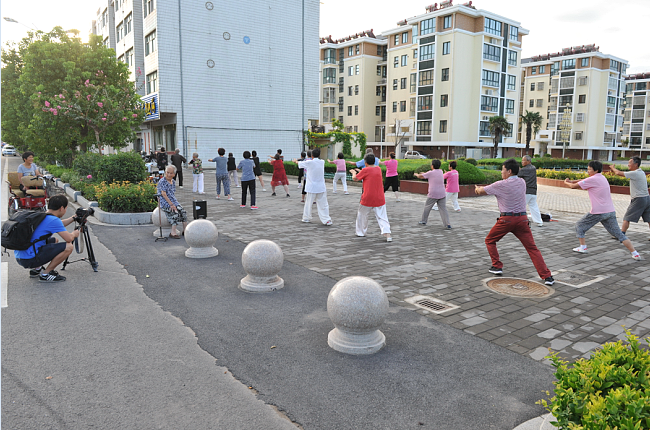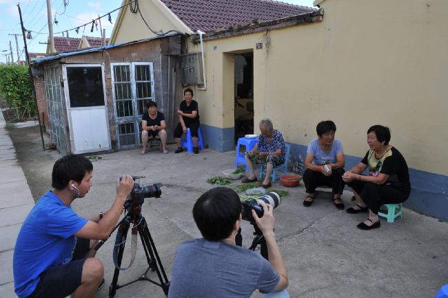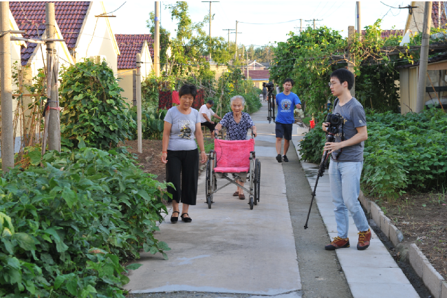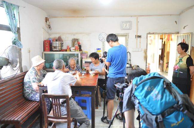 8月20下午-21日,澎湃新聞采訪組視頻記者朱偉輝、視頻編輯龍景和射陽縣新聞單位的3名記者在農(nóng)場宣傳部門相關(guān)人員的陪同下,用一天半的時間,實時用鏡頭記載百歲老人從凌晨起床、喝早茶、散步、游玩和吃飯、擇菜、做針線活以及與家人、鄰居等聊天的情況,感受百歲老人尋常的起居生活。而每拍攝一場老人的生活起居或是生活畫面,總是讓來自上海澎湃新聞采訪組的記者大加贊嘆。圖為澎湃新聞采訪組在拍攝百歲老人生活起居的一組鏡頭。