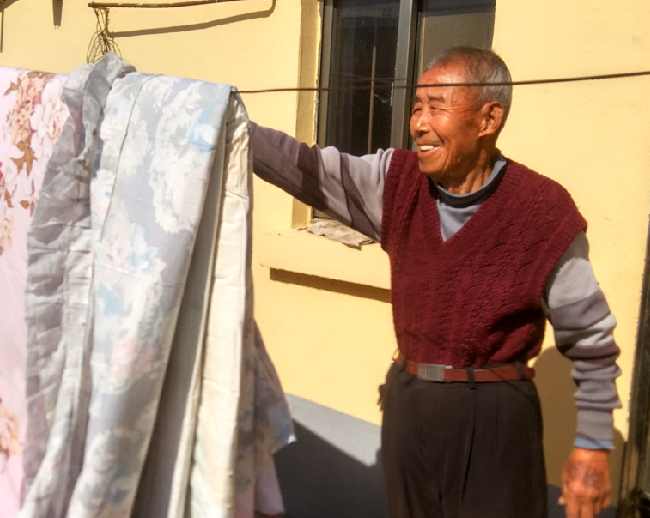 在李朋友家采訪過程中,李朋友的女兒李月春告訴我,她父親也是一個非常愛干凈的人,不但家里家外收拾的清清爽爽。只要晴天,天天把被子抱出來曬,并且一直堅持自己的衣服自己洗,從不要兒女摻和。就是睡的被褥自己來勾,換季床鋪也是自己來開,樣樣事做得是像模像樣,從來不要兒媳她們來搭半點手。沒事時常拿著掃帚幫助一旁兒子們開的農機修理間打掃衛生,就是門前的路上,老人也常拿著掃帚清掃路面,有時還向兩邊打掃出去有百十米長,讓負責這片的環衛工都要感謝他。