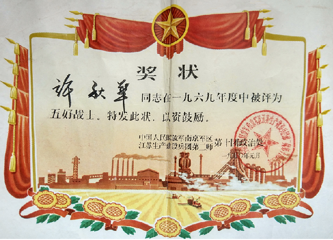 “聽說淮海籌建的農建四師暨淮海農場歷史陳列館有知青這方面的資料館,我特地把這份珍藏已久的上山下鄉期間獲得的獎狀和致家長同志們的一封信捐獻給陳列館,讓大家一起銘記那個年代崢嶸的革命歲月!”近日,無錫知青許秋華特地請人把獎狀和印有最高指示的一封信請人轉交給了農建四師二期工程建設陳列館的工作人員手中,望著這頗有歷史厚重感的實物,好似令人重新回到了那段難忘的歲月。