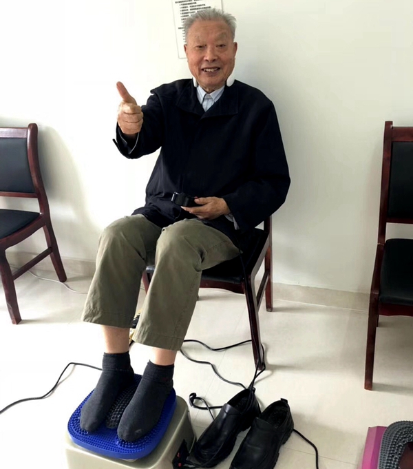“董爹爹,你快來試試這個足底按摩儀,很舒服哦!”姚奶奶呼喚著老朋友,你一言我一語地交流著體驗感受,于是便留下了姚奶奶比著“耶”,董爹爹豎起大拇指的生動照片。