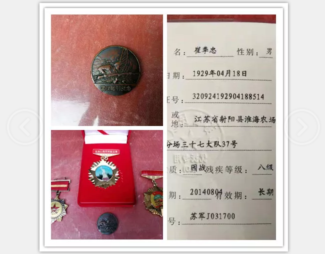 1929年出生的崔季忠今年已經(jīng)90歲,崔季忠老人最先在許世友將軍轄區(qū)的12縱隊,老人跟了許世友將軍3年,在鹽城劉莊戰(zhàn)役三進三出中就有崔季忠的身影,戰(zhàn)役最終只有老人和其他兩位戰(zhàn)友幸存下來,但他們整個部隊在只剩3個人的情況下,仍然抓獲了40多名俘虜。崔季忠的嘴是在淮海戰(zhàn)役中攻打濟南時受的傷,并被炮彈打掉了3顆牙齒,負傷后轉到六分區(qū)訓練新兵,后又轉到102師參加渡江戰(zhàn)役,直接打到上海。之后他又修整了3個月,最后參與了解放崇明戰(zhàn)爭,并在1952年到淮海農場參與建設。