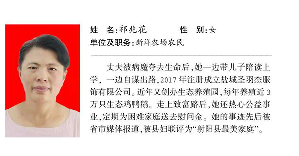 近日,傳來喜訊,祁兆花被評(píng)為第五屆“最美射陽人”。丈夫被病魔奪去生命后,祁兆花一邊帶兒子陪讀上學(xué),一邊自謀出路,2017年注冊(cè)成立鹽城圣羽杰服飾有限公司。近年又創(chuàng)辦生態(tài)養(yǎng)殖園,每年養(yǎng)殖近3萬只生態(tài)雞鴨鵝。走上致富路后,她還熱心公益事業(yè),定期為困難家庭送去慰問金。她的事跡被省市媒體報(bào)道,先后被評(píng)為鹽城市第二季“最美巾幗”、射陽縣“最美家庭”等。