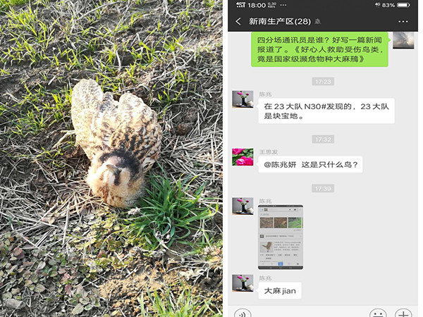 12月13日下午3點(diǎn),新洋農(nóng)發(fā)分公司新南生產(chǎn)區(qū)技術(shù)員陳兆妍在二十三大隊N30號田檢查時,突然發(fā)現(xiàn)一只大鳥無法飛行,發(fā)出陣陣哀嚎。