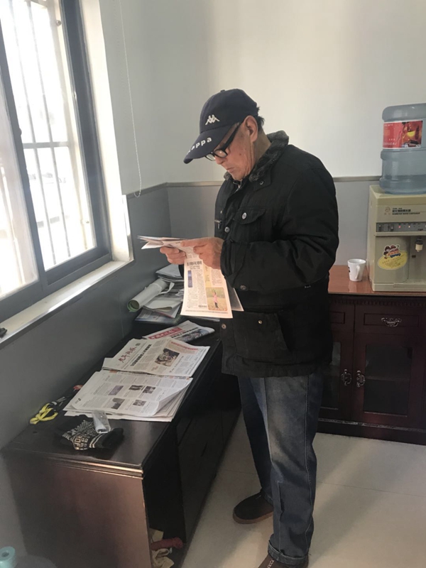 城東居委會主任邱金龍告訴筆者,起初是他偶爾將報紙上看到的社會新聞及農場趣事分享給老人們,發現他們都饒有興致,于是就將報紙都整理出來放在矮柜上讓老人們自己翻閱,久而久之,就形成了這個“報紙角”。邱主任說,這些報紙放著也是放著,與其堆在角落里落灰,不如拿來給老人們讀一讀,鍛煉他們的理性思維能力,豐富他們的科學文化知識,充實他們的精神文化生活,他們看的開心,我們也覺得很有意義。老人們也不挑剔,默不作聲,有什么就看什么,漸漸地,大家都不約而同,隔段時間就來看看有沒有新報紙。