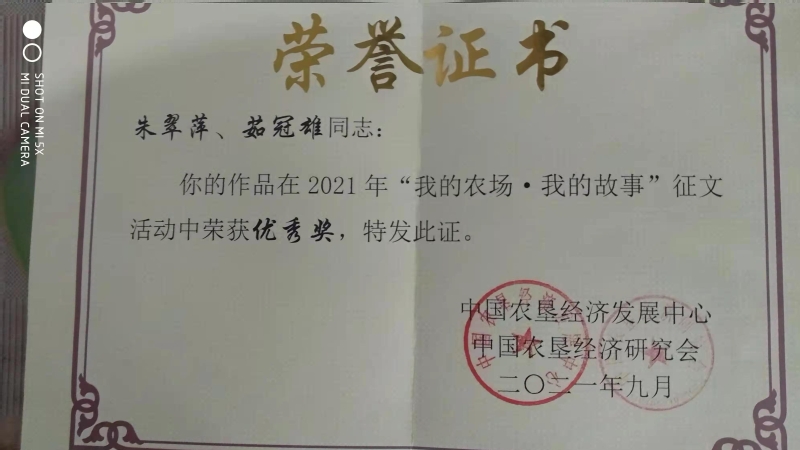 近日,弶港農(nóng)場(chǎng)杜鵑居委會(huì)黨員朱翠萍、茹冠雄夫婦收到了中國(guó)農(nóng)墾經(jīng)濟(jì)發(fā)展中心,中國(guó)農(nóng)墾經(jīng)濟(jì)研究會(huì)寄來的2021年“我的農(nóng)場(chǎng),我的故事”征文獲獎(jiǎng)榮譽(yù)證書。