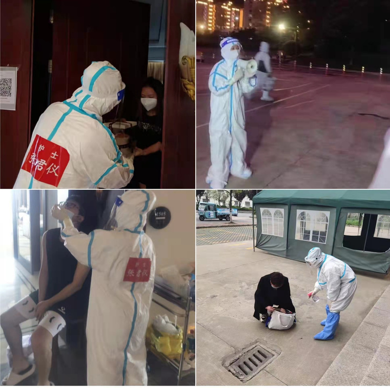 隔離點的工作繁瑣、繁雜,防護措施嚴格,每次進入隔離區(qū)前要在準備間戴帽子和N95口罩、穿防護服、戴護目鏡、穿靴套等保護設(shè)施,穿戴好防護用品后,她給隔離人員分發(fā)三餐,配備1:1000的消毒液進行隔離房間的環(huán)境消殺,并將所有隔離人員的物資、生活用品、所產(chǎn)生的醫(yī)療及生活垃圾都要一層一層爬樓梯搬運,由于射陽西區(qū)人才公寓隔離點沒有電梯,再加上嚴實密不透風的防護服,就是一動不動,也會大汗淋漓,每次都是內(nèi)層衣濕透,汗流浹背,工作完成一半就已經(jīng)精疲力盡,只能原地休息幾分鐘再繼續(xù)上下樓梯完成工作,一套流程做下來都要近五個小時。有時面對不理解、有抵觸情緒的人員,她會以盡心盡力的服務(wù)給他們以溫暖、依靠、希望及強有力的支撐,她說:隔離是對自己負責、對大家負責、更是對我們國家負責,你們是為國家早日戰(zhàn)勝疫情作貢獻,鼓勵他們積極配合隔離點做好隔離工作。