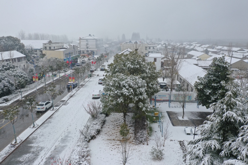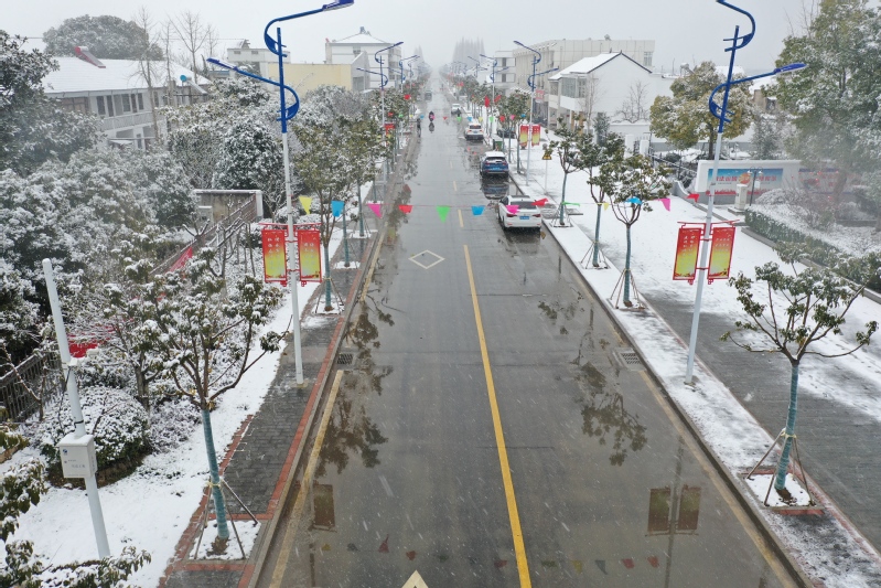 高大的銀杏樹、柿子樹,落光了葉子的枝杈上,一條條毛茸茸、亮晶晶的銀條兒好像蟄伏著的蠶蟲;修長的香樟、低矮的柏樹,四季常青枝葉上,一朵朵蓬松松、沉甸甸的雪球,仿佛舉起的棉花糖。“呼……”一輛晨起的公交車閃著光駛過,一面面紅旗也迎風雀躍起來,似乎在說“又是一個豐收年”。