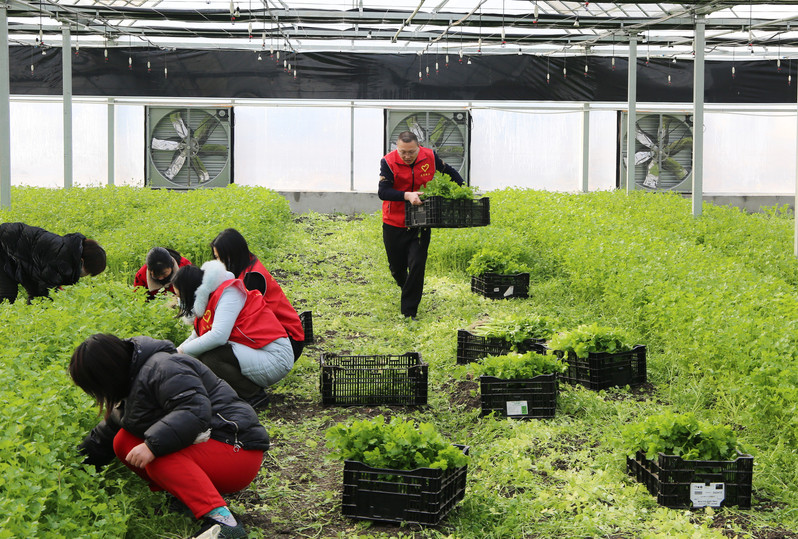 富民科技園蔬菜大棚內志愿者們分工合作,有的人負責摘芹菜、有的人負責去清理雜草、有的負責捆芹菜、有的人負責把芹菜裝上車、有的負責運輸芹菜,大家分工有序,不怕苦,不怕累,忙得熱火朝天。