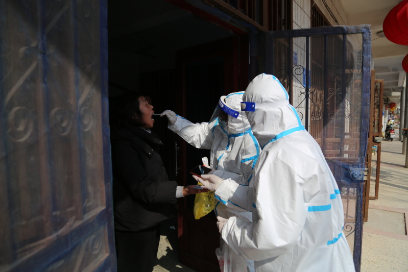 35日,連云港市海州區通報發生新冠肺炎疫情,形勢十分嚴峻。崗埠上下迅速行動起來,按照要求組織開展全員核酸檢測。全員核酸檢測要求一天內對崗埠所有在家人員進行檢測,農場四個點位同時開始,負責檢測的人員特別緊張。馬素蓮得知這一情況,主動和相關人員溝通,暫停了自家門診,帶領醫生錢冬梅、護士錢明霞加入了振興廣場籃球場監測點的核酸檢測人員隊伍。從35日到11日,她們三人一直堅守在核酸檢測一線,每天檢測人員合計達到兩三千人。有時候,她們需要配合網格員深入鎮區、生產區各居委會上門為行動不便的人員進行采樣,足跡遍布大街小巷,密不透風的防護服常常讓她們滿臉通紅透不過氣來。護士錢明霞告訴筆者,311日當天,她負責部分小區的核酸采樣工作,光是6樓就爬了6次,腿最后跟灌了鉛一樣,挪不動。“有時候晚上嘴里吃著東西就睡著了。”
