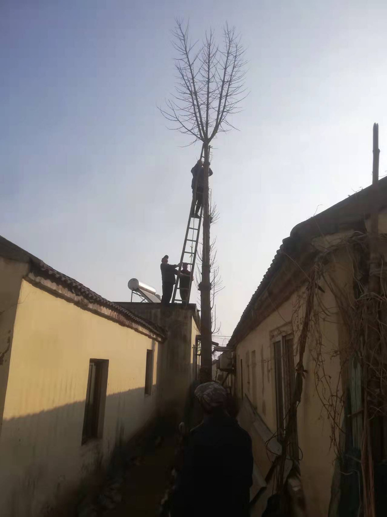 3月9日上午8時,按照事先制定的方案,由農場社區環綠所所長張海濤帶隊,城西居委會協助,和環綠所員工一行7人來到幸福小區。首先對最高最粗最難砍伐的銀杏樹進行砍伐。為防止大樹倒下砸壞兩邊房屋,有砍伐經驗的環綠所老員工李素兵現場提出:“從上到下,分段砍伐。”在征得張所長及眾人的同意后,李素兵立馬系好安全帶攀上樹頂,用手工鋸將銀杏樹頂端的叉枝逐個鋸掉,然后又用電鋸將銀杏樹從上到下分4段切割,最終平穩將銀杏樹砍伐。緊接著一行人又來到另兩顆樹的地方,用同樣的方式,互相協作,很快又將兩顆樹砍伐。現場圍觀的居民群眾對砍伐房前屋后到三顆樹個個拍手稱快。李志明老夫婦倆看到自家廚房后面10多米高的銀杏樹被伐,說了一句:“從今往后總算能睡個安穩覺了,謝謝大家,謝謝!謝謝……”