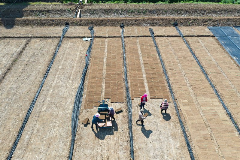 51日,寶應湖農場三分場場頭一派忙碌,擺盤、鏟土、倒稻種,7、8名工人分工合作,有序進行著落谷育秧。