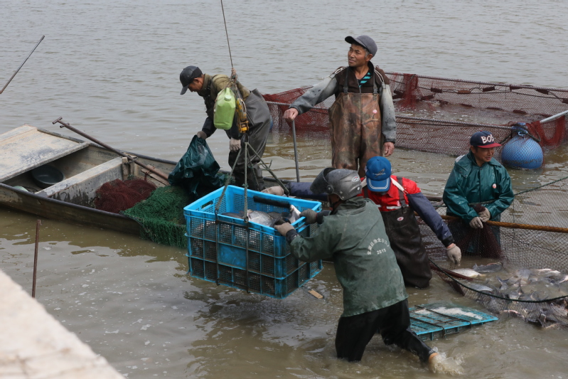 513日,寶應湖農場劉圩養殖場養殖戶楊金林正在起捕塘口鳊魚。