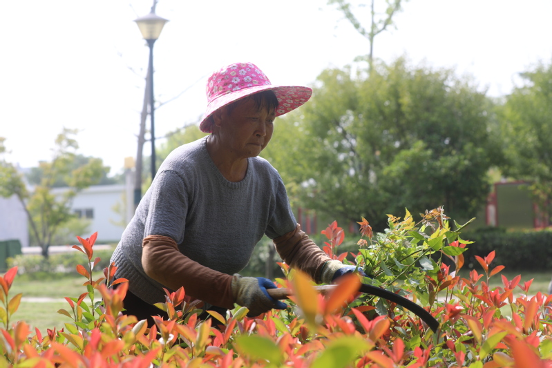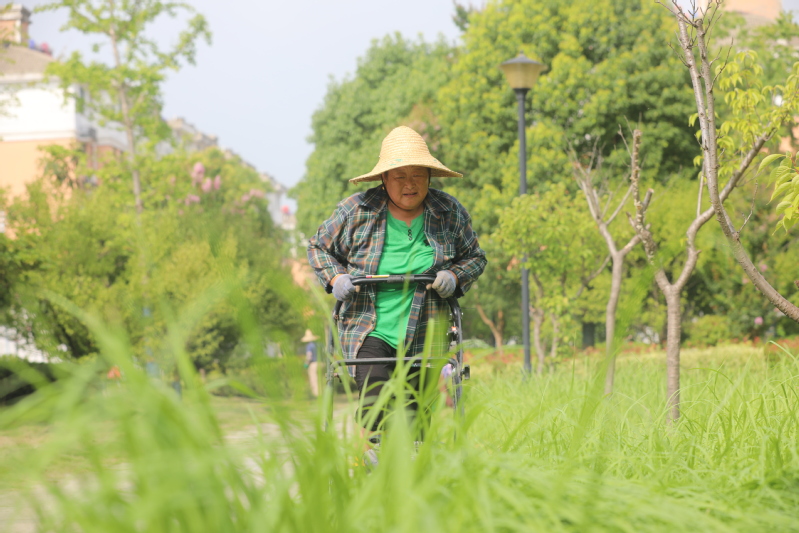 7月27日,寶應(yīng)湖農(nóng)場(chǎng)職工文化公園,7名工人正在為公園綠化除草。越是高溫雜草長(zhǎng)得越旺。以席正英為隊(duì)長(zhǎng)的綠化員們分工合作。草坪上用電動(dòng)切草機(jī)清理,隨著“隆隆”的機(jī)聲,切碎的草屑在刀頭間飛濺,濺到了工人的身上、飛上了工人的臉龐,刺癢刺癢,淡淡的青草味洋溢在夏日的晨光里。綠化帶里,爬騰類(lèi)的雜草枝枝蔓蔓,覆蓋的綠化樹(shù)上,工人們就用手先拉斷經(jīng)脈,再扯掉枝葉;低矮類(lèi)的雜草擁擠在綠化樹(shù)間,工人們蹲下身子就用手拔、用刀割。當(dāng)天7名工人清理綠化300多平方米。