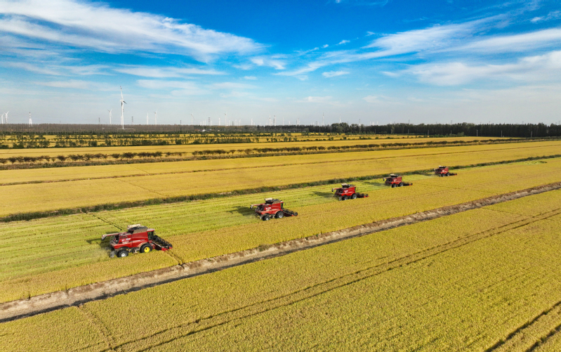 2023年10月28日,在蘇墾農(nóng)發(fā)新洋分公司新南生產(chǎn)區(qū)19大隊的高標準農(nóng)田上,五臺凱斯7088大型聯(lián)合收割機穿梭在稻田中搶收水稻。蘇墾農(nóng)發(fā)新洋分公司搶抓晴好天氣,發(fā)揮農(nóng)墾企業(yè)機械化優(yōu)勢,確保秋糧顆粒歸倉。