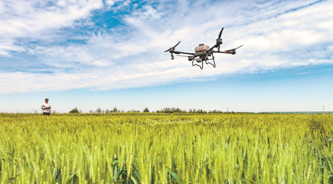 在射陽縣江蘇農墾新洋農場,無人機飛手進行“一噴三防”作業。張偉生