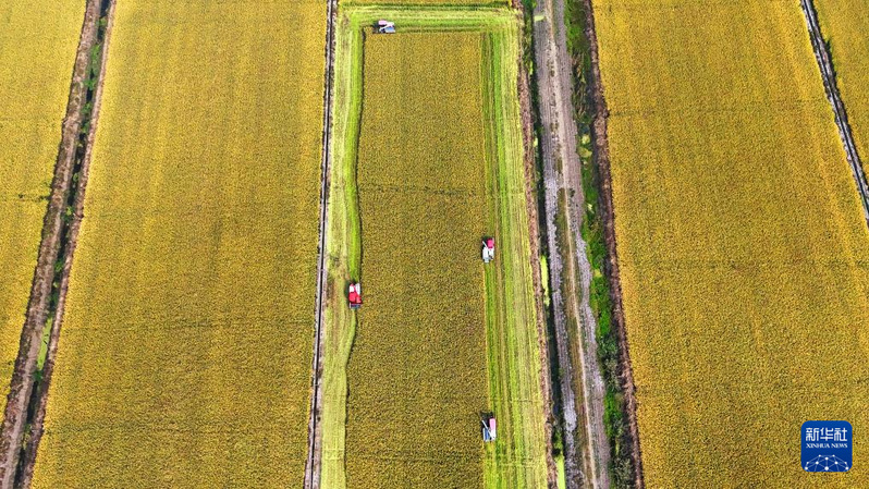 江蘇省連云港市海州區(qū)崗埠農(nóng)場工作人員在搶收水稻(無人機照片)。新華社發(fā)(耿玉和 攝)