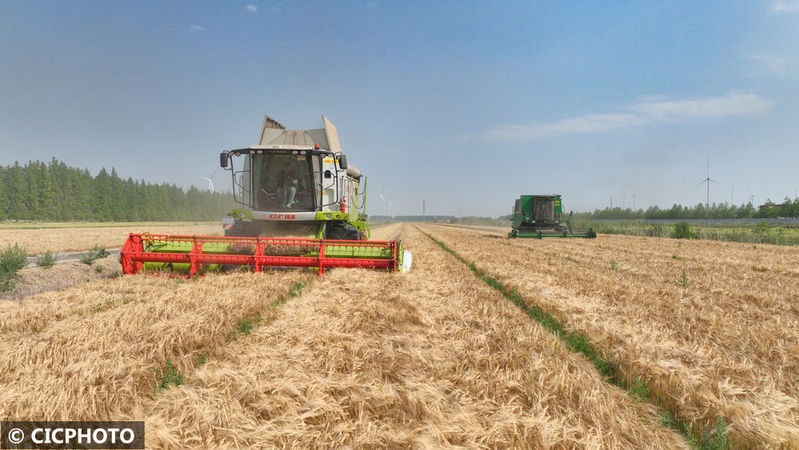 2025年5月20日,聯合收割機在位于江蘇省鹽城市射陽縣的江蘇農墾新洋農場大麥田里作業。CICPHOTO/張偉生 攝