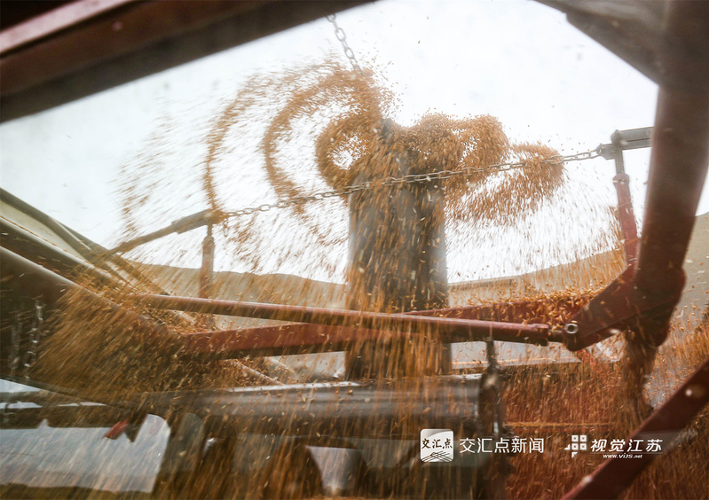 (特約攝影  許昌銀  錢(qián)厚紅  15:24攝  20:39上線)五月的麥田,金穗飄香。5月26日,淮安盱眙洪澤湖畔的江蘇農(nóng)墾三河農(nóng)場(chǎng)的3.82萬(wàn)畝小麥開(kāi)鐮收割。當(dāng)?shù)乩们绾锰鞖饧泳o收割,確保顆粒歸倉(cāng)。