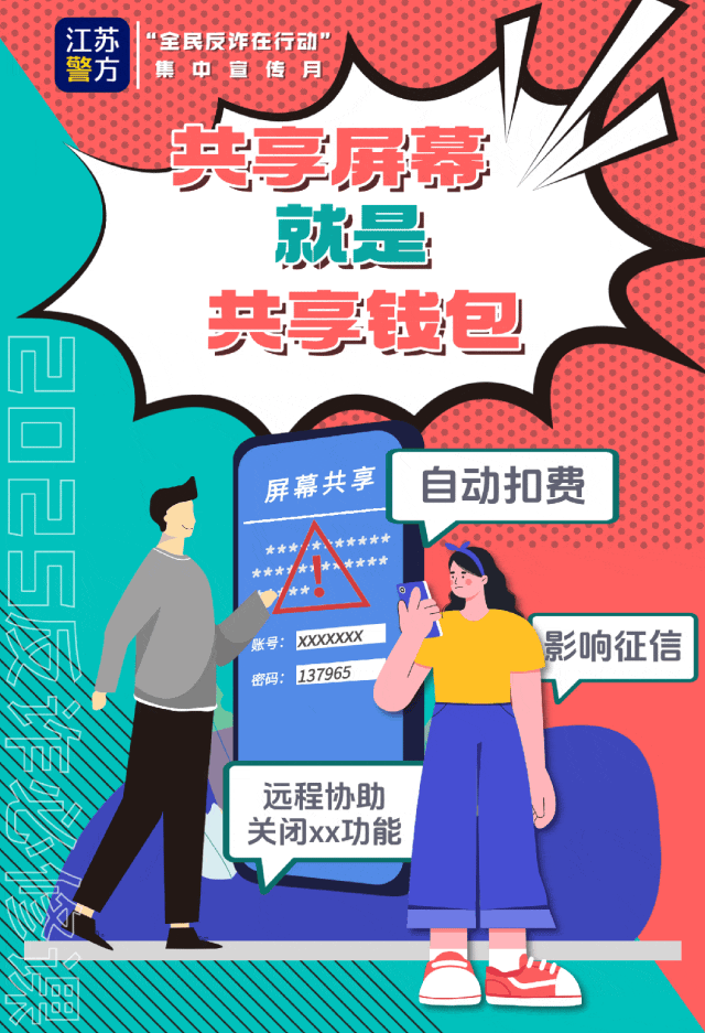 劃重點:騙子以自動扣費、影響征信等為由,聲稱需要關(guān)閉某項服務(wù),并可以通過共享屏幕來“手把手”教學(xué)。但事實上,一旦共享屏幕,就等于共享了所有信息,你的驗證碼、密碼都將在對方的屏幕上一覽無遺。