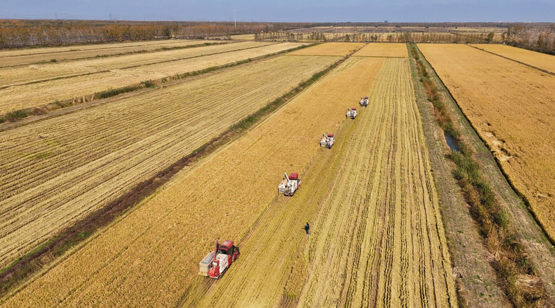 11月5日,連云港市海州區(qū),江蘇農(nóng)墾崗埠農(nóng)場的高標準農(nóng)田里,職工駕駛收割機來回穿梭,開展水稻搶收工作。連日來,當?shù)胤e極組織人員、機械,搶抓農(nóng)時做好水稻收割工作,爭取盡快完成秋收,確保顆粒歸倉。徐衛(wèi) 方冉冉 攝