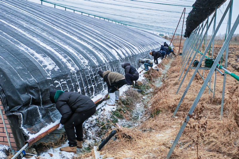 面對大風和積雪壓力,設施結構的穩固是第一道關卡。“一、二、三!大家不要松手,再加把勁。”1月18日一大早,為應對寒潮,高效農業示范園第一時間組織人員對園區內所有大棚進行全面加固。同時,對保溫棉被進行檢修和更換,確保其保溫性能處于最佳狀態。同樣,在云臺農場云水灣景區,技術團隊也提前完成了所有生產大棚的結構檢查與加固,重點提升設施的物理抗逆能力,云水灣景區負責人崔婷婷介紹道,“所有棚室的通風口均已提前密封,并儲備了充足的專用保溫被,用于夜間覆蓋以有效蓄熱。例如在藍莓種植區,我們特別采取了‘雙層覆膜+加厚保溫被’的強化方案,全力鎖住溫度。工作人員也加強了監控和維護,確保農作物的健康生長。”