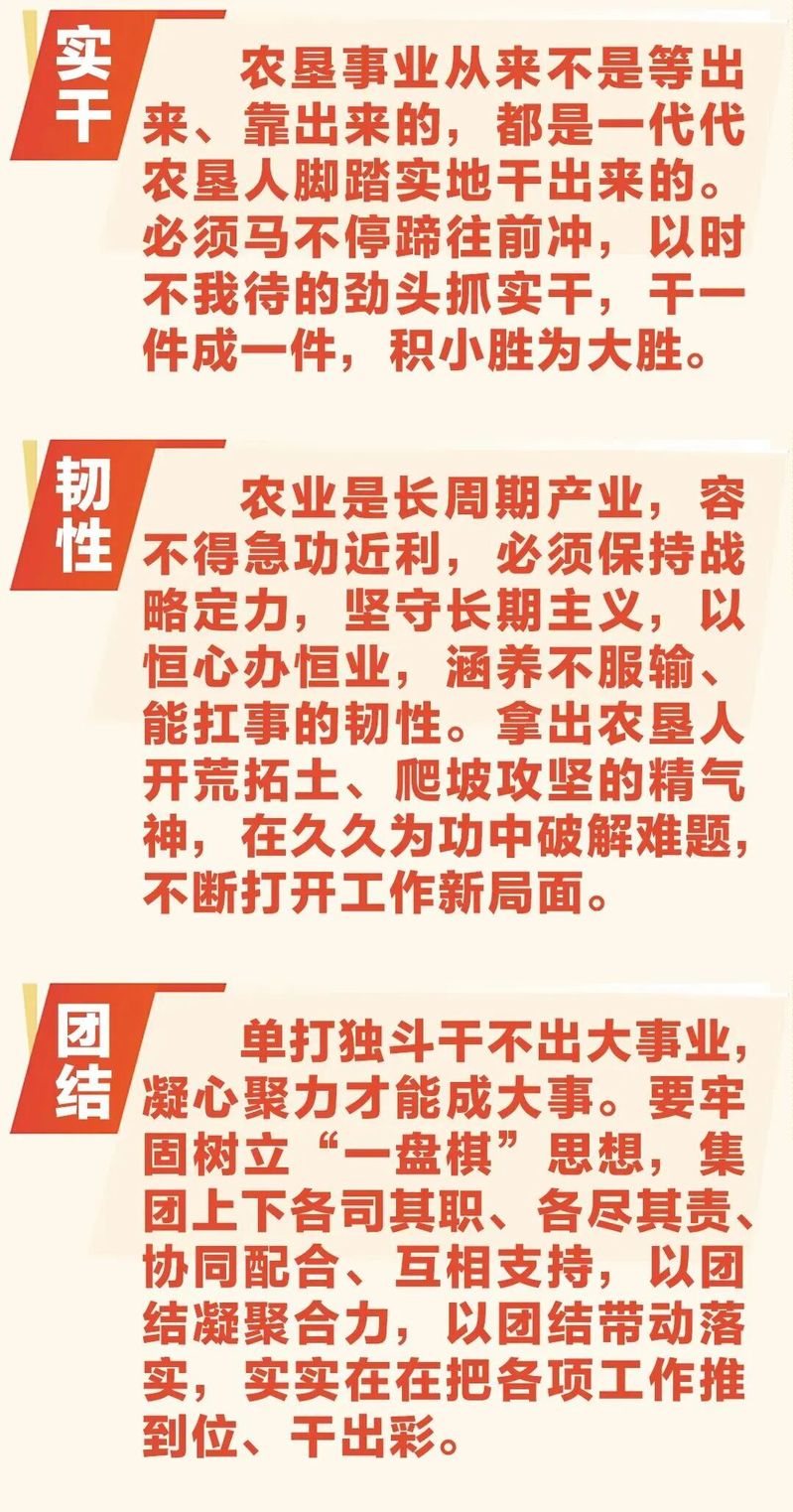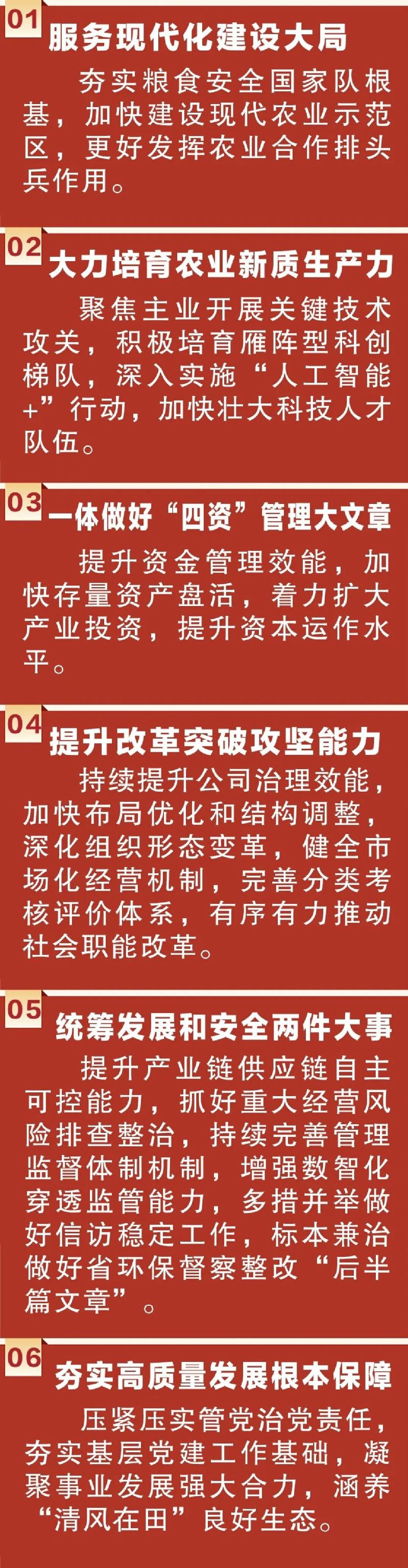 會議全面回顧了集團2025年及“十四五”時期改革發展成果。2025年,集團各項經營指標穩中有進,糧食生產能力得到鞏固提升,產業發展后勁不斷增強,創新驅動發展支撐有力,全面深化改革有序落實,企業治理體系更加完善,黨建引領保障持續強化,集團總體發展態勢保持穩健向好。會議還系統總結了“十四五”期間所取得的寶貴經驗,要始終保持戰略定力、穩步提升經濟實力、有效增強示范能力、充分展現產業張力、持續激發內生動力、廣泛凝聚干事合力,這為“十四五”發展圓滿收官畫上了濃墨重彩一筆,更為集團“十五五”高質量發展奠定了堅實基礎。