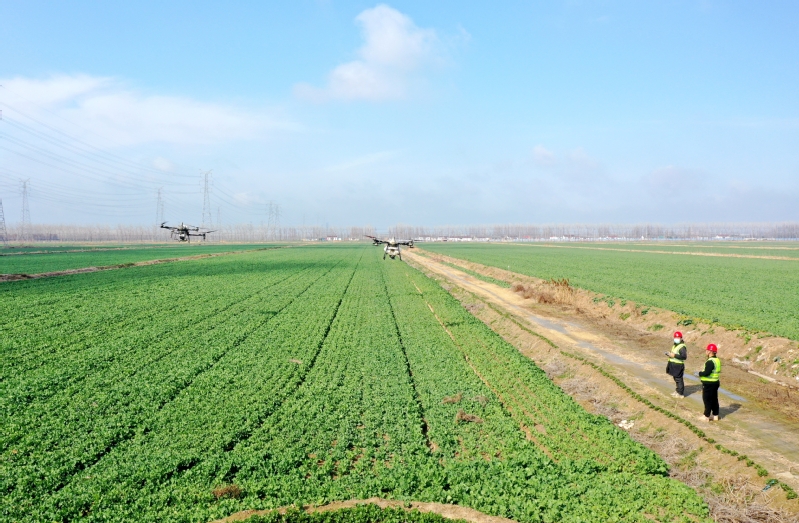 蘇墾農發新曹分公司立足小麥、油菜生長特性,以“保苗越冬、提質增效”為核心目標,通過“苗情監測精準化+技術指導常態化+作業服務智能化”,扎實推進冬季田間管護各項工作,全力守護全年農業生產成果。圖為植保無人機進行農藥噴灑作業。
