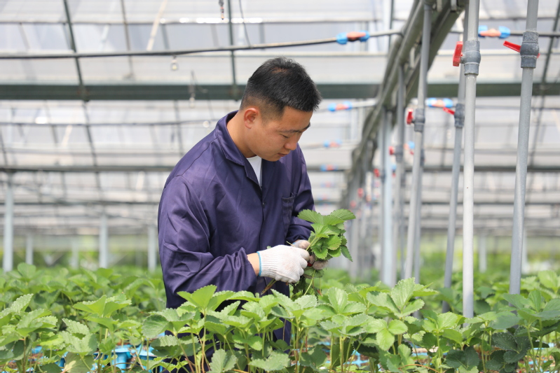當前正值草莓苗生長的關鍵期,在三河農場科技園區草莓高架大棚內,工作人員正在打草莓老葉并檢查草莓苗的生長情況,以便及時預防赤霉病、炭疽病等各種病蟲害。