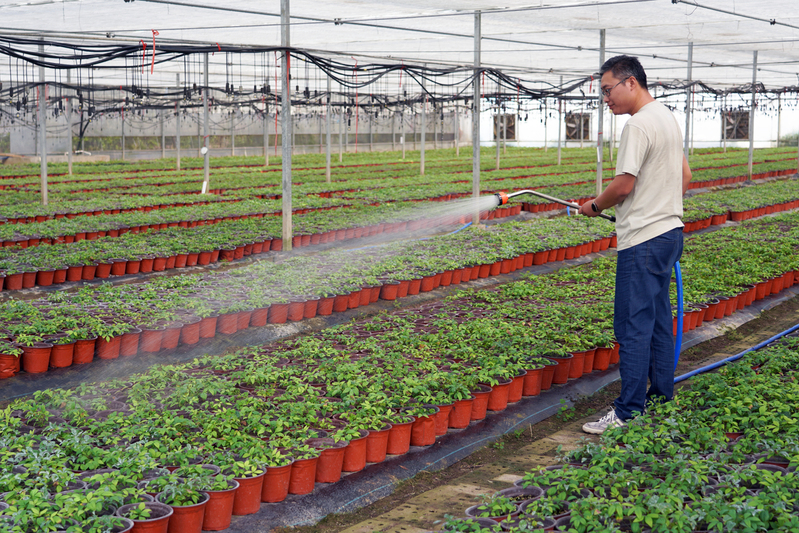 三伏天連日高溫,走進弶港農場容器苗基地大棚內卻是一片蔭涼,一盆盆火焰南天竹容器苗綻綠吐翠,綻放著勃勃生機。面對連續的高溫少雨天氣的烤驗,該場林業中心利用電動遮陽網、濕簾風機、噴淋系統進行有效降溫,5萬株容器苗在“熱辣滾燙”的天氣下安全度夏。預計,十月份容器苗即可達到出售標準。圖為林業中心管理人員噴施水溶肥。