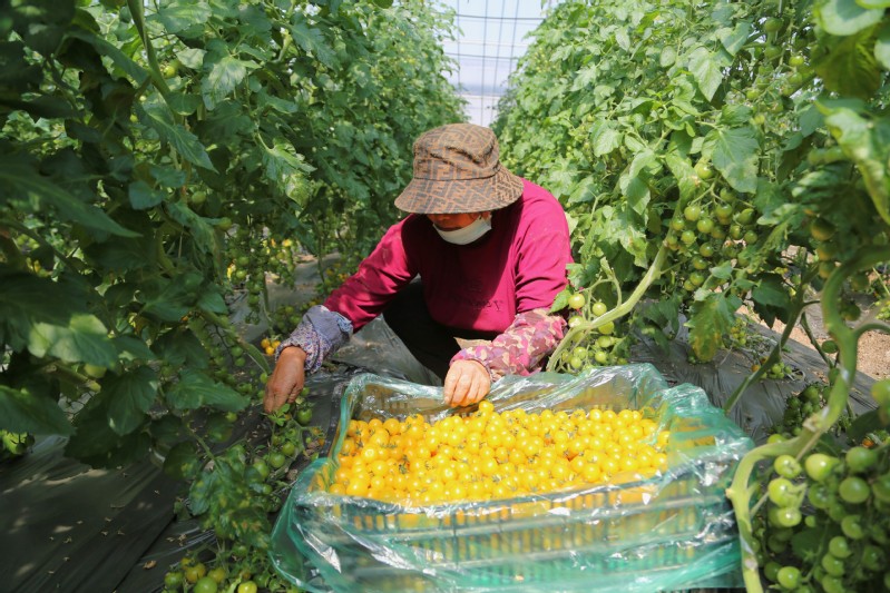 5月13日,崗埠農場公司富民農業科技園里,工人們在田間采收西紅柿,供應市場銷售。據悉,采收的西紅柿品種優良,均價每斤10元左右,收益比普通西紅柿高五成以上。