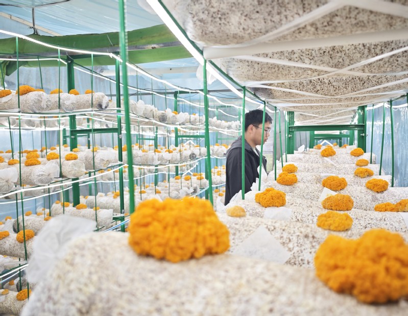 經過一個月時間的培育,金耳菌在淮海農場公司試種成功并將進入采摘銷售環節。今年來,淮海農場公司通過培植羊肚菌、赤松茸等食用菌產業,助力鄉村振興。圖為5月12日,技術人員正在檢查金耳菌的生長情況。