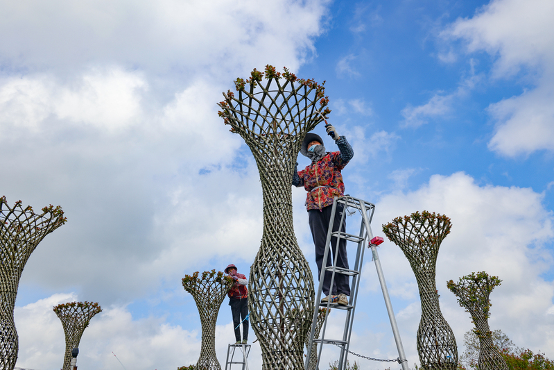 5月3日上午,在新洋容器苗項目基地,林業工人們堅守崗位一線,手拿工具,正忙碌地進行紫薇花瓶去芽作業。近期隨著氣溫持續走高,萬物復蘇,容器苗項目基地里的紫薇花瓶枝芽生長進入高峰期。“若不及時去除而任嫩芽生長,勢必造成樹干上枝葉茂盛,遮擋花瓶瓶體,破壞整個造型的美觀,更為嚴重的是與頂部生長爭搶水肥。”基地負責人梁亞洲介紹,紫薇花瓶在生長期的時候要取出嫩芽,把紫薇的花枝截短,太長在開花的時候就會影響整體的形狀,影響市場價值。