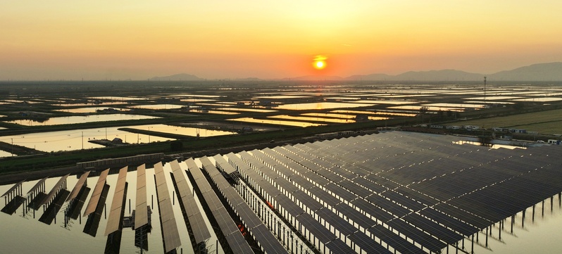 5月3日傍晚,位于東辛農場的江蘇農墾第一座漁光互補光伏電站項目現場,發電設備與一抹夕陽、萬畝魚塘構成一幅美麗畫卷。
