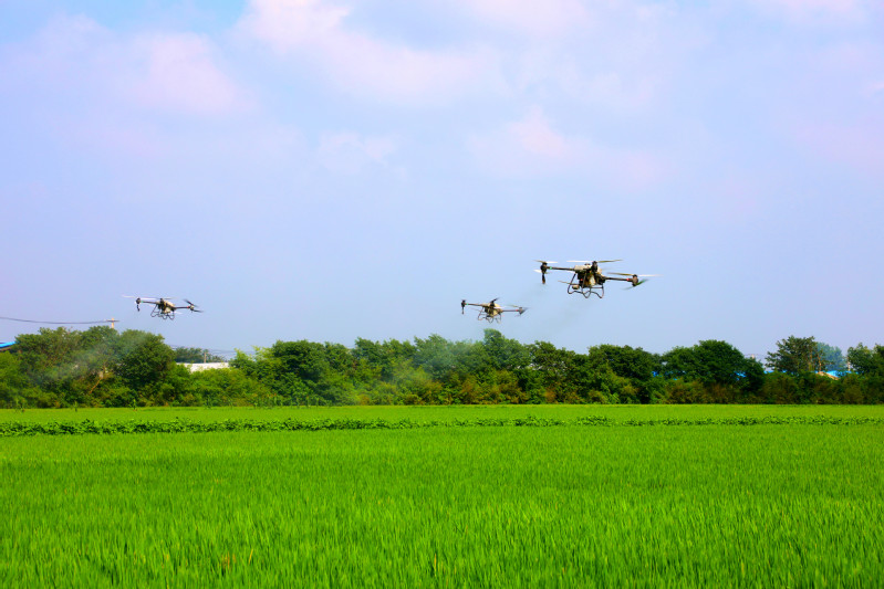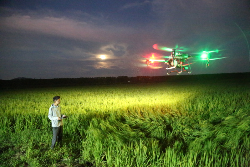 近年來,蘇墾農發三河分公司高度重視農機裝備智能化發展與管理,目前已經實現無人機全程噴藥、施肥。當前正值水稻抽穗期,三河分公司精心組織,認真抓好水稻后期以稻曲病、稻瘟病、稻縱卷葉螟、稻飛虱和葉面噴肥等為主的綜合防治工作,為秋糧豐產高產提供保障。