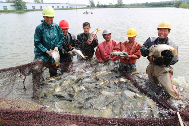 春放秋捕,共話豐收。走進崗埠農場公司南漁場的鯉魚養殖基地,一條條肥美的鯉魚不斷躍出水面,引起水花四濺。8月29日,崗埠農場公司水產養殖中心迎來鯉魚“大豐收”,養殖基地內熱鬧開捕秋天第一網鯉魚。初秋的早晨已然涼意十足,早上不到6點,天剛蒙蒙亮,捕撈人員就來到魚塘開網起魚。在水產公司工作人員的指揮下,一張巨大的漁網隨著捕魚工人的移動緩緩張開,大家不顧冰冷的水下溫度,緊張忙碌了起來。經過鋪底、收網、聚攏等環節的共同協作,漁網被慢慢升起……整個現場一片繁忙熱鬧景象。經過近三個小時的忙碌,在大家的精心分揀下,裝滿魚的筐子被吊車有序吊起,稱重、記錄、放魚一氣呵成。“這個吊車頂部的黃色圓塊就是電子秤,吊起魚的同時,秤上的信號就發到這個無線接收裝置上來,秤重既方便又精準。”現場記賬的方正解釋說。“看這些魚,品相好、質量高,抓都抓不住,活蹦亂跳的,真是大豐收啊!”起魚的工人們雖然全身都已濕透,但是看著手里的大魚,臉上洋溢著收獲的笑容。據悉,本次捕撈的鯉魚名叫“福安鯉”,在春季投放,采取訂單式捕撈銷售。當天,2.2萬斤“淮河牌”福安鯉被送上等候已久的運輸車,銷往本省徐州市及河南省等地。“養殖中心依托豐富水