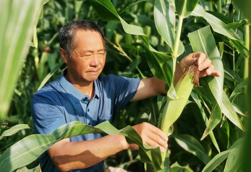 9月6日,蘇墾農發東辛分公司玉米大豆帶狀復合種植田里,農技人員正在查看玉米長勢,豐收在望。