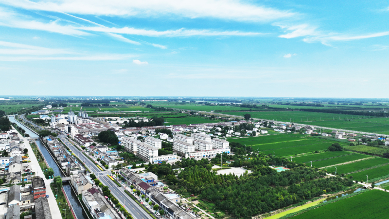 白馬湖農場多措并舉打造宜居宜業和美鄉村,使農場環境越發整潔,農業生產更加綠色,為職工居民留住了自然生態的田園風光。圖為藍天、白云、碧水、綠野環繞下的場部場鎮一角。