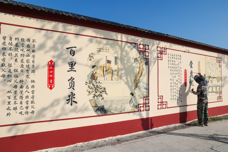 9月7日,在云臺農場普山路街道上,工作人員正在繪制“二十四孝”文化墻,一幅幅生動形象、圖文并茂的文化宣傳內容引人入勝,不僅扮靚了場域環境,也成為云臺農場引領文明新風的重要手段。